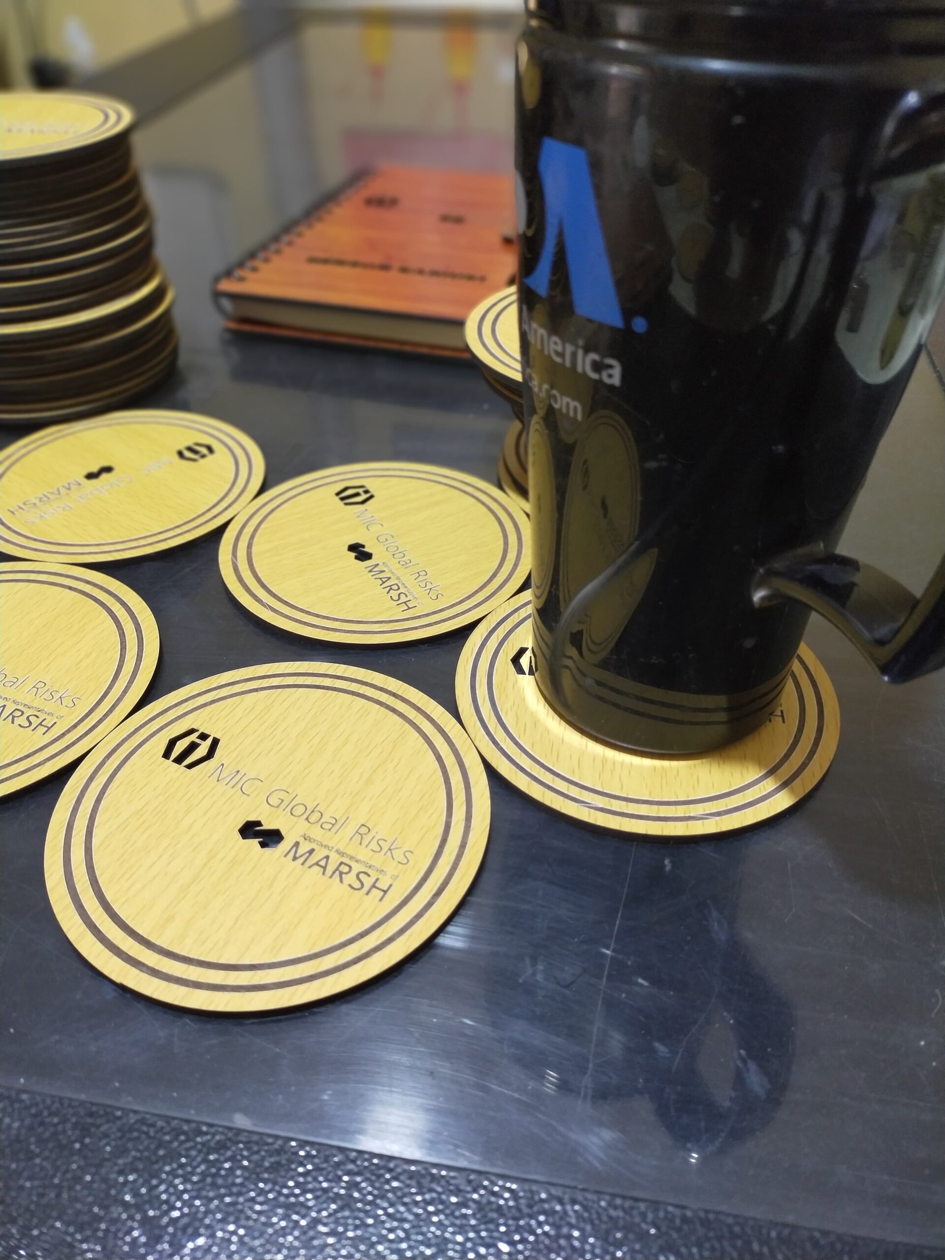 Personalized coasters made from various materials, perfect for adding a unique touch to home or office spaces.